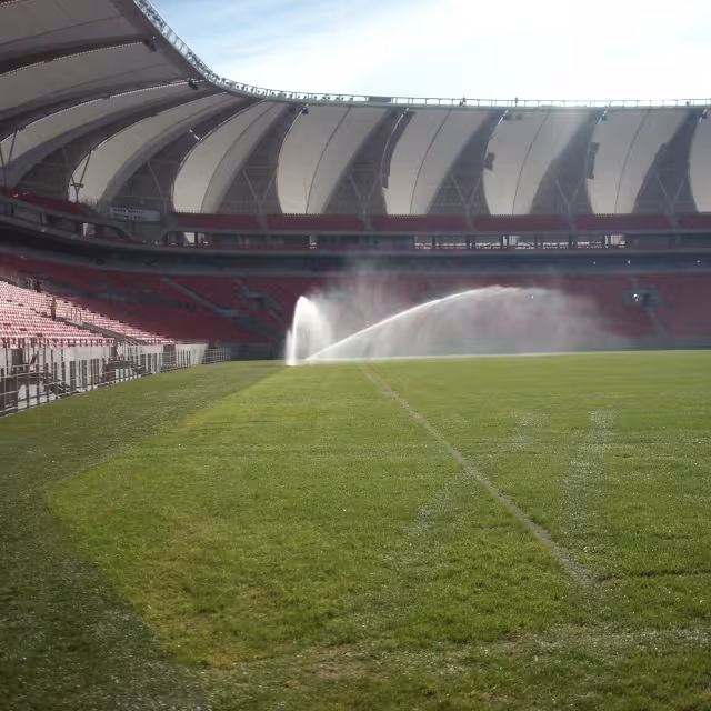 La programmation gère le stade, mais également les abords, soit environ 3 hectares de parkings et d’espaces verts arrosés par des turbines Hunter ; les végétaux sont arrosés avec du goutte-à-goutte Netafim. Le stade, quant à lui est arrosé avec des turbines Rain Bird selon un schéma de 10 turbines centrales commandées par 2 vannes électriques situées en bordure de terrain et 14 turbines à vannes incorporées de périphérie.