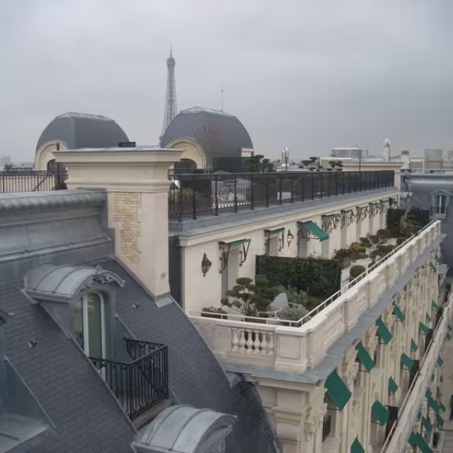 Chacune des ces suites est reliée à son jardin privatif qui se trouve au septième étage. Les jardins du dernier étage ont été dessinés par un paysagiste ; l’ensemble offre un panorama spectaculaire à 360° sur Paris. Nous découvrons là haut des vraies pelouses aménagées avec placage de gazon et d’immenses balconnières plantées de pins et de plantes à fleurs, le tout avec une vue imprenable sur la Tour Eiffel !