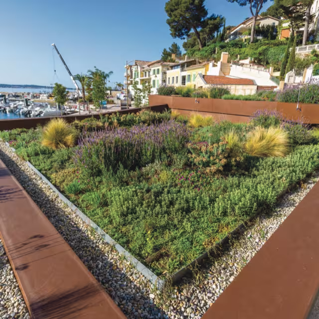 Sanary-sur-Mer (83) has undertaken the redevelopment of its port, including a new harbour-master’s office. The client’s ambition was to ensure that this building was covered with vegetation so that the pedestrians and surrounding homes have a view of the roofs of the building.