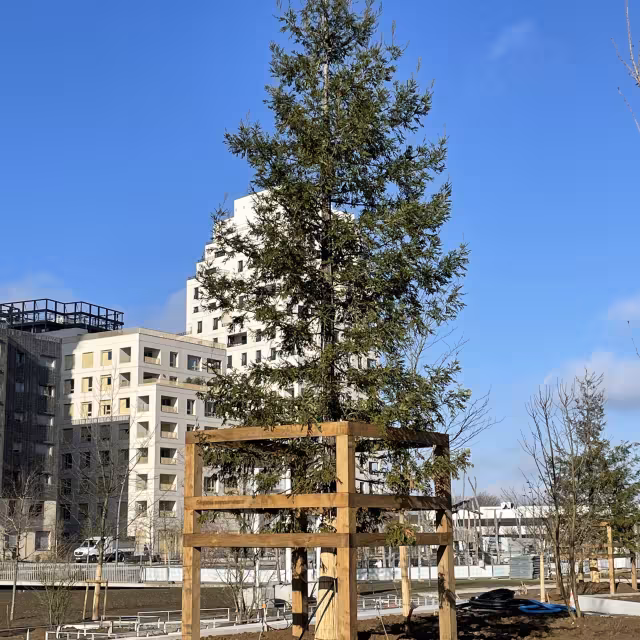 Il m’explique « Les arbres ont été sélectionnés dans une pépinière, puis ils ont été marqués et réservés ». S’est ensuite posé la question du transport et du levage des arbres, qui font 15 mètres de haut et pèsent pas moins de 5 tonnes. Les mottes mesuraient 2.40 m de diamètre sur 1 mètre de hauteur ! Chaque arbre a été transporté par camion et il a fallu une grue pour les lever. « Cinq fosses de 5 x 5 mètres de côté et 1.5 mètres de profondeur ont été creusés. On a soulevé les arbres et on les a posés dans des fosses » reprend C. Jegaden. Les mottes ont été posées au fond des fosses, sur un mélanger terre-pierre constituant la couche portante. Ils ont ensuite remblayé avec de la terre particulière. Enfin, les arbres ont été équipés d’un système de tutorage très important, de 4 m x 4 m.