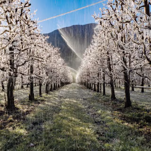 2- Individual targeted protection: This method uses overhead micro sprinklers. In this case, a single sprinkler is positioned above each tree and its flow rate and the area to be irrigated specifically targets the tree. Targeted protection has the distinct advantage of using lower flow rates compared with the full cover method. Consequently, the water requirements per hectare are also much lower. Apart from the fact that lower water requirements provide operational savings, it also means that the farmer can actually provide protection for a larger surface area with the same amount of water. The targeted protection method provides localized frost protection by only targeting the trees, thus avoiding the irrelevant spaces between the rows. Providing that the system is properly designed, this more targeted protection method is much more water-efficient and profitable. Tropical and subtropical crops that might be exposed to winter frosts lend themselves very well to this approach and can benefit fully from a targeted frost protection.