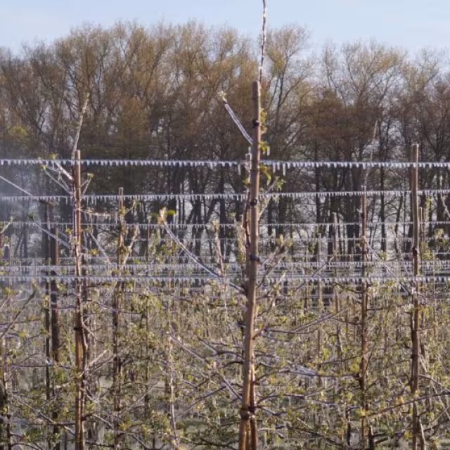 micro-sprinklers, which apply less water than conventional sprinklers, the goal is to maintain a temperature of about 0 °C only on the ground under the trees. This is in order to concentrate and enhance radiation and sensible heat transfer upwards into the plants. In some places there is a tendency to avoid wetting the foliage of the trees. In this case, under-tree sprinkler irrigation is adequate. However, this application can only protect the trees to a limited extent. It is customary to use under-tree frost protection only when the expected minimum temperature is higher than -2 C°. Furthermore, even at temperatures of -2 C°, when using under-tree sprinkler irrigation, there is a risk of exposing the upper parts of the tree to frost damage.